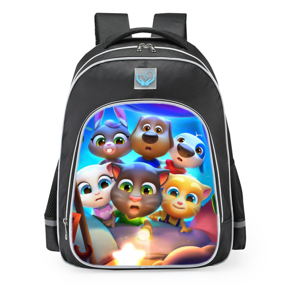 My Talking Tom Friends School Backpack. Adjustable S-shape shoulder straps, comfortable to carry. A strap and a handle on the top. High quality zippers. Polyester and nylon lining, Water Resistant and easy to clean.Size Inches: 12x8x16.5 (Width x Depth x Height)Size cm: 30x20x42 (Width x Depth x Height) Volume: 27LFabric: 100% Polyester Oxford ClothWeight: 460gIf you're interested in customization or making your own backpack, please click the DIY icon at the top of our site.
