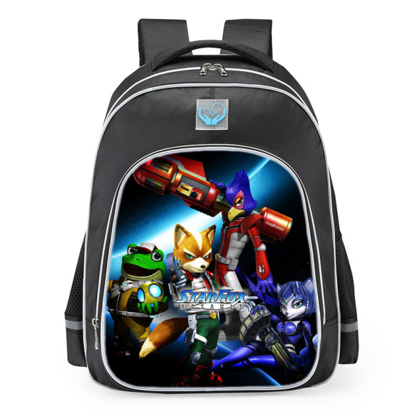 Star Fox Assault School Backpack. A wide, easy-access opening plus a clear front pocket make it a cinch to pack and grab necessities, while the mesh bottle pocket keeps drinks handy.