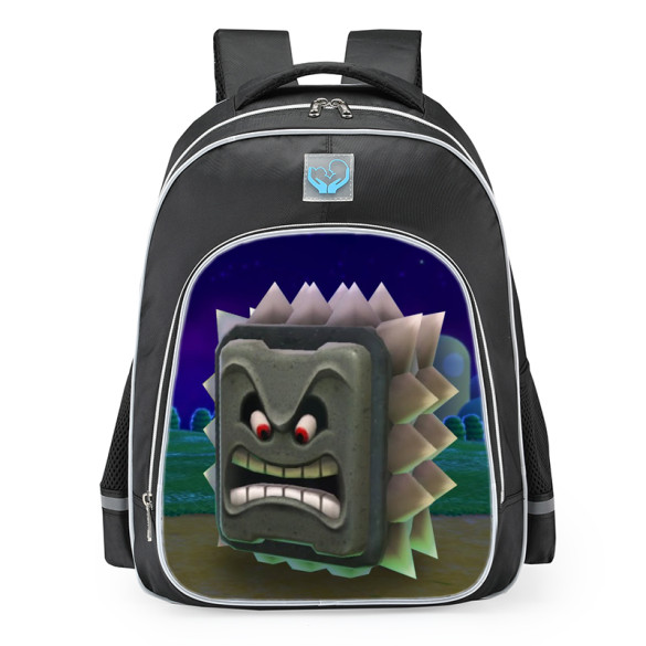 Super Mario Villain Thwomp School Backpack. Adjustable padded shoulder straps make it more comfortable when carrying, ergonomically designed airflow padded back panel to prevent overheating and ease the back and protect the shoulders.Size Inches: 12x8x16.5 (Width x Depth x Height)Size cm: 30x20x42 (Width x Depth x Height) Volume: 27LFabric: 100% Polyester Oxford ClothWeight: 460gIf you're interested in customization or making your own backpack, please click the DIY icon at the top of our site.