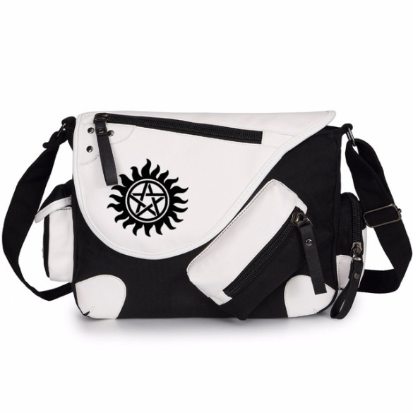 The Supernatural Shoulder Bag has 2 outer compartments and a pouch on the side for a smartphone or similar gadget. The inside features another zippered compartment and a split compartment with cushioning for a laptop up to 15" in size. The inside of the bag is lined with fabric that features printed icons from the game, the flap closes with magnetic buttons.