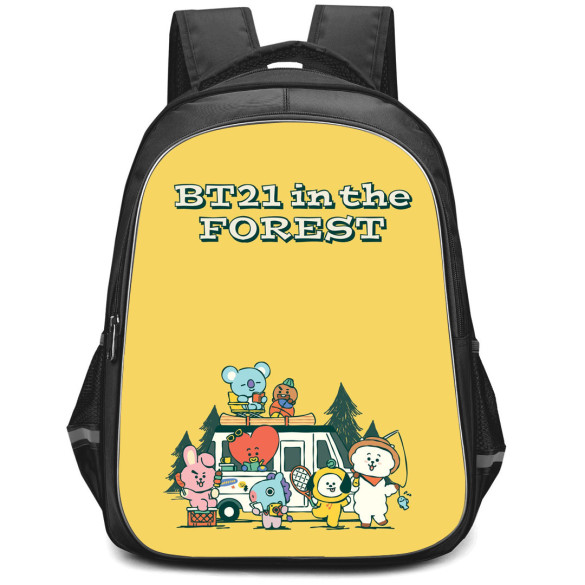 Get the BT21 Backpack StudentPack in the vibrant BT21 In The Forest Yellow Background. Perfect for students and fans of the popular BT21 characters, this backpack combines style and functionality.Our StudentPack is ultra durable and trendy, designed especially for students both young and old. Featuring one main compartment, a front compartment, and all of the space you could ever imagine. Durable and lightweight, the StudentPack is the perfect throw-on-and-go backpack for students.Features:- Roomy main compartment- Front compartment- 2 mesh pockets on both sides- Built to last, high quality waterproof oxford cloth- Adjustable padded shoulder straps- Front pocket with built in organizer- Padding on the back panel for superior comfort- Padded grab handle on top- High quality metal zips- 100% recycled undyed linerSpecifications:Fabric: 100% Polyester Oxford ClothCapacity: 15L (Small size) / 27L (Large size)Weight: 17.63 oz / 500gDimensions: Large size: 16.5" x 13" x 6.3" / 42 x 33 x 16 cmSmall size: 13" x 11" x 6.3" / 32 x 28 x 16 cm