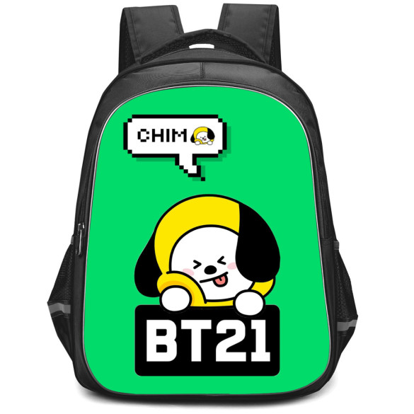 This BT21 Chimmy Backpack StudentPack showcases an adorable Chimmy avatar on a vibrant green background, perfect for students on the go. Carry your essentials with style and cuteness!Our StudentPack is ultra durable and trendy, designed especially for students both young and old. Featuring one main compartment, a front compartment, and all of the space you could ever imagine. Durable and lightweight, the StudentPack is the perfect throw-on-and-go backpack for students.Features:- Roomy main compartment- Front compartment- 2 mesh pockets on both sides- Built to last, high quality waterproof oxford cloth- Adjustable padded shoulder straps- Front pocket with built in organizer- Padding on the back panel for superior comfort- Padded grab handle on top- High quality metal zips- 100% recycled undyed linerSpecifications:Fabric: 100% Polyester Oxford ClothCapacity: 15L (Small size) / 27L (Large size)Weight: 17.63 oz / 500gDimensions: Large size: 16.5" x 13" x 6.3" / 42 x 33 x 16 cmSmall size: 13" x 11" x 6.3" / 32 x 28 x 16 cm