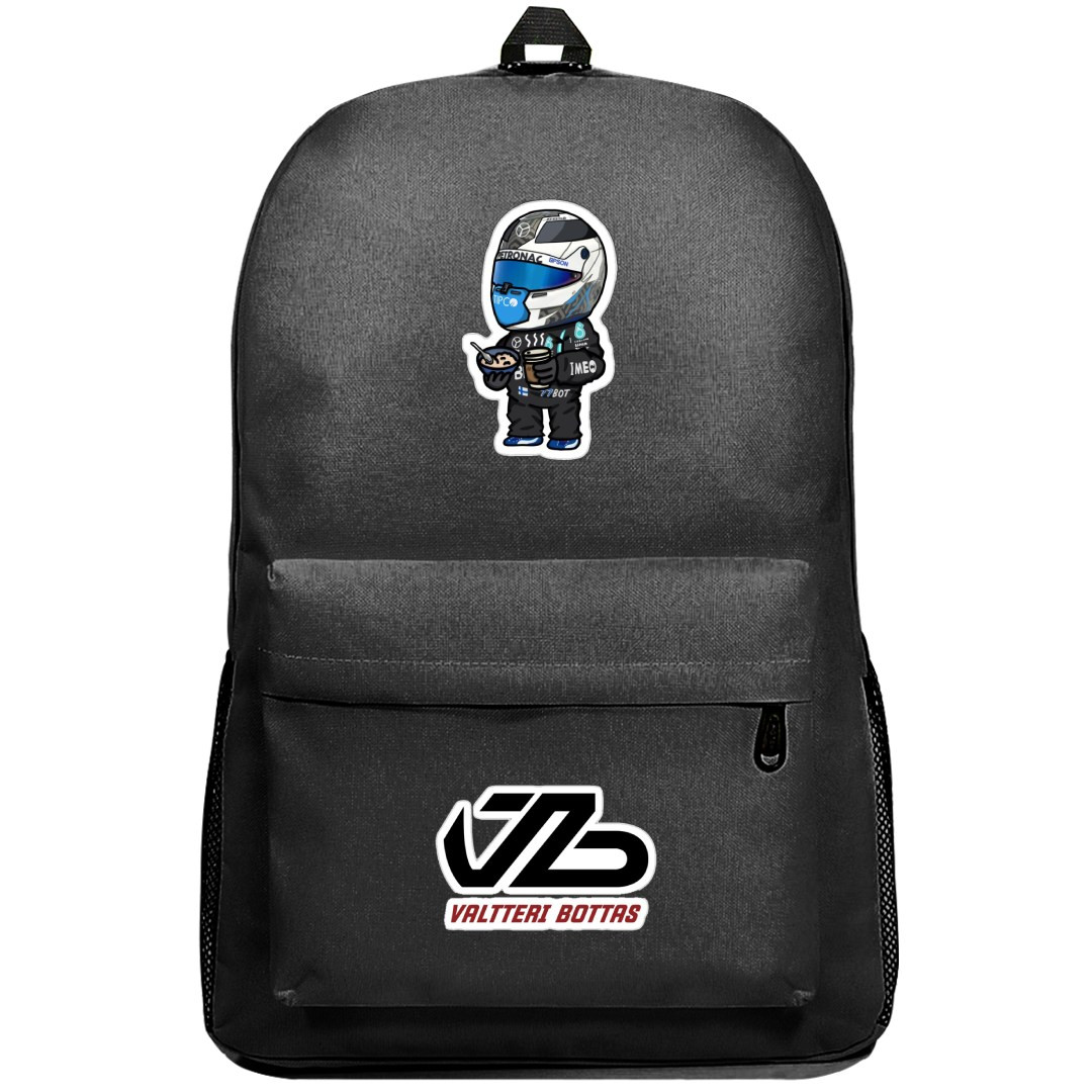 Shop the F1 Valtteri Bottas Backpack SuperPack, adorned with cool sticker chibi art. Carry your essentials in style and show off your love for motorsports.Our SuperPack series backpacks are ultralight and perfect for everyday use. Featuring padded shoulder straps for extra comfort and support, and an organizer compartment to help keep all your little bits together. These backpacks are for those who want extra comfort, protection, and style. Features:- Roomy main compartment- Inner pocket within main compartment- Built to last, high quality polyester oxford cloth- Adjustable straight cut padded shoulder straps- Front pocket with built in organizer- Padding in center of back panel for superior comfort- Grab handle on top- Zipper pulls have cord tabs for easy grab access- 100% recycled undyed linerSpecifications:Fabric: 100% Polyester Fabric Oxford ClothCapacity Superpack: 1647 cu in / 27 LCapacity Plus: 1709 cu in / 28 LCapacity Pro: 1647 cu in / 27 LWeight Superpack: 14.1 oz / 400gWeight Plus: 17.53 oz / 500gWeight Pro: 14.1 oz / 400gDimensions Superpack: 17.7" x 12.2" x 7" / 45 x 31 x 18 cmDimensions Plus: 18.9" x 11.6" x 6.3" / 44 x 31 x 15 cmDimensions Pro: 17.3" x 11.8" x 6.3" / 44 x 30 x 16 cm