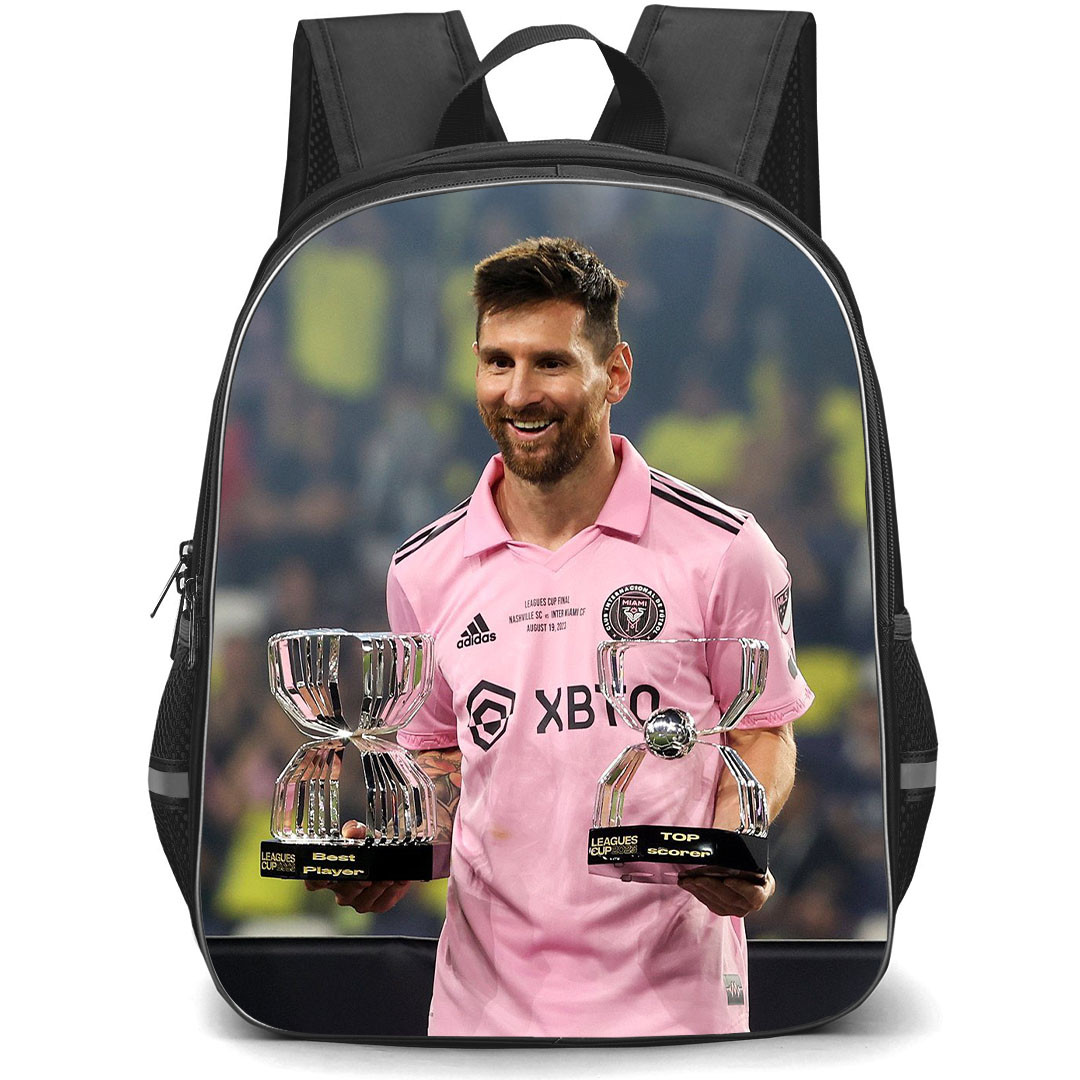 Get ready for school with the Inter Miami CF Lionel Messi Backpack StudentPack. Featuring a stunning portrait of Lionel Messi, the best player and top scorer, this backpack is a must-have for football fans.Our StudentPack is ultra durable and trendy, designed especially for students both young and old. Featuring one main compartment, a front compartment, and all of the space you could ever imagine. Durable and lightweight, the StudentPack is the perfect throw-on-and-go backpack for students.Features:- Roomy main compartment- Front compartment- 2 mesh pockets on both sides- Built to last, high quality waterproof oxford cloth- Adjustable padded shoulder straps- Front pocket with built in organizer- Padding on the back panel for superior comfort- Padded grab handle on top- High quality metal zips- 100% recycled undyed linerSpecifications:Fabric: 100% Polyester Oxford ClothCapacity: 15L (Small size) / 27L (Large size)Weight: 17.63 oz / 500gDimensions: Large size: 16.5" x 13" x 6.3" / 42 x 33 x 16 cmSmall size: 13" x 11" x 6.3" / 32 x 28 x 16 cm