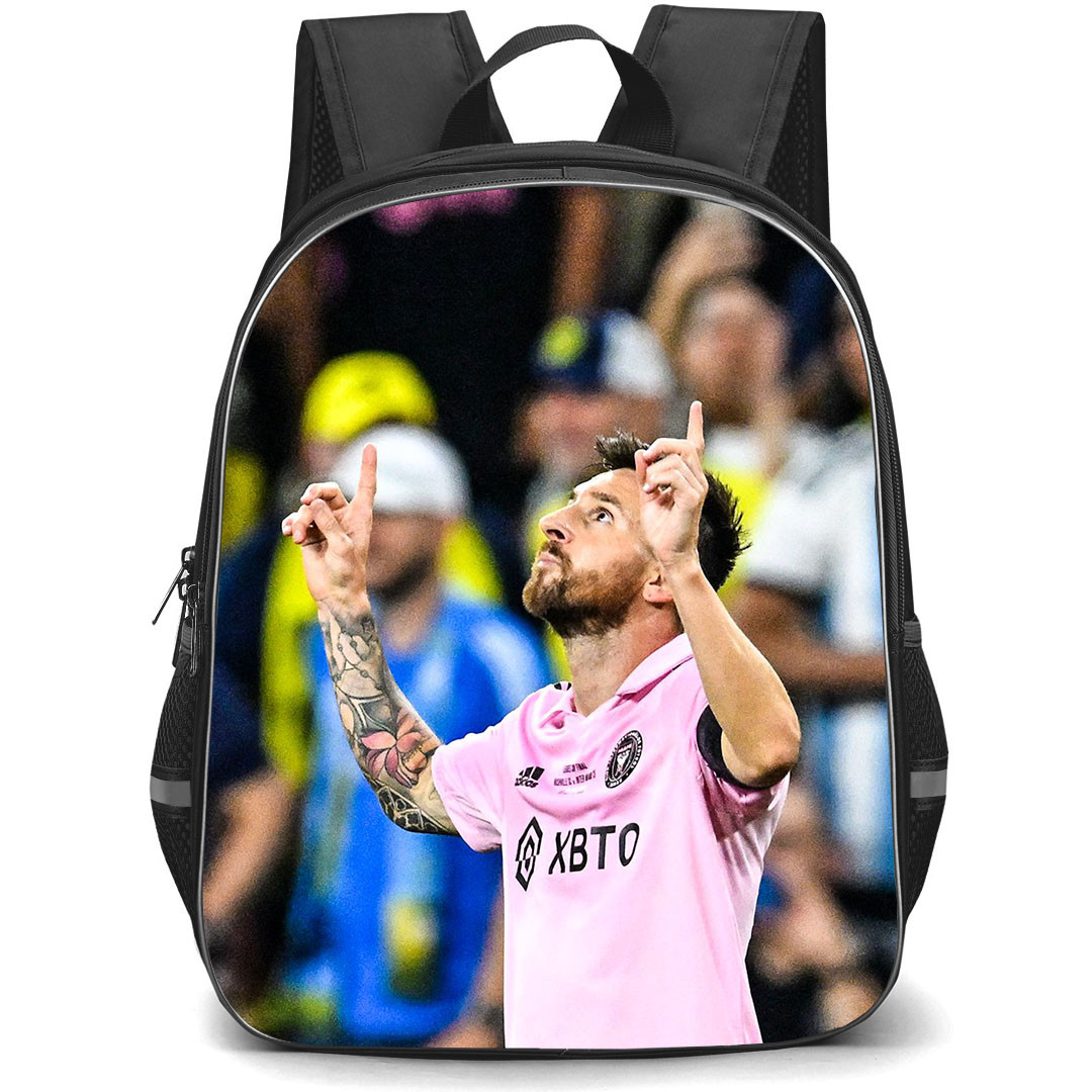 Get your hands on the Inter Miami CF Lionel Messi Backpack StudentPack featuring Lionel Messi pointing up. Perfect for students and fans alike, this backpack showcases your love for both Inter Miami CF and the iconic Messi.Our StudentPack is ultra durable and trendy, designed especially for students both young and old. Featuring one main compartment, a front compartment, and all of the space you could ever imagine. Durable and lightweight, the StudentPack is the perfect throw-on-and-go backpack for students.Features:- Roomy main compartment- Front compartment- 2 mesh pockets on both sides- Built to last, high quality waterproof oxford cloth- Adjustable padded shoulder straps- Front pocket with built in organizer- Padding on the back panel for superior comfort- Padded grab handle on top- High quality metal zips- 100% recycled undyed linerSpecifications:Fabric: 100% Polyester Oxford ClothCapacity: 15L (Small size) / 27L (Large size)Weight: 17.63 oz / 500gDimensions: Large size: 16.5" x 13" x 6.3" / 42 x 33 x 16 cmSmall size: 13" x 11" x 6.3" / 32 x 28 x 16 cm