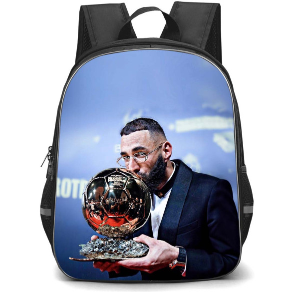 Shop the Karim Benzema Backpack StudentPack, featuring an iconic image of Karim Benzema kissing his Ballon d'Or trophy, perfect for a passionate football fan.Our StudentPack is ultra durable and trendy, designed especially for students both young and old. Featuring one main compartment, a front compartment, and all of the space you could ever imagine. Durable and lightweight, the StudentPack is the perfect throw-on-and-go backpack for students.Features:- Roomy main compartment- Front compartment- 2 mesh pockets on both sides- Built to last, high quality waterproof oxford cloth- Adjustable padded shoulder straps- Front pocket with built in organizer- Padding on the back panel for superior comfort- Padded grab handle on top- High quality metal zips- 100% recycled undyed linerSpecifications:Fabric: 100% Polyester Oxford ClothCapacity: 15L (Small size) / 27L (Large size)Weight: 17.63 oz / 500gDimensions: Large size: 16.5" x 13" x 6.3" / 42 x 33 x 16 cmSmall size: 13" x 11" x 6.3" / 32 x 28 x 16 cm