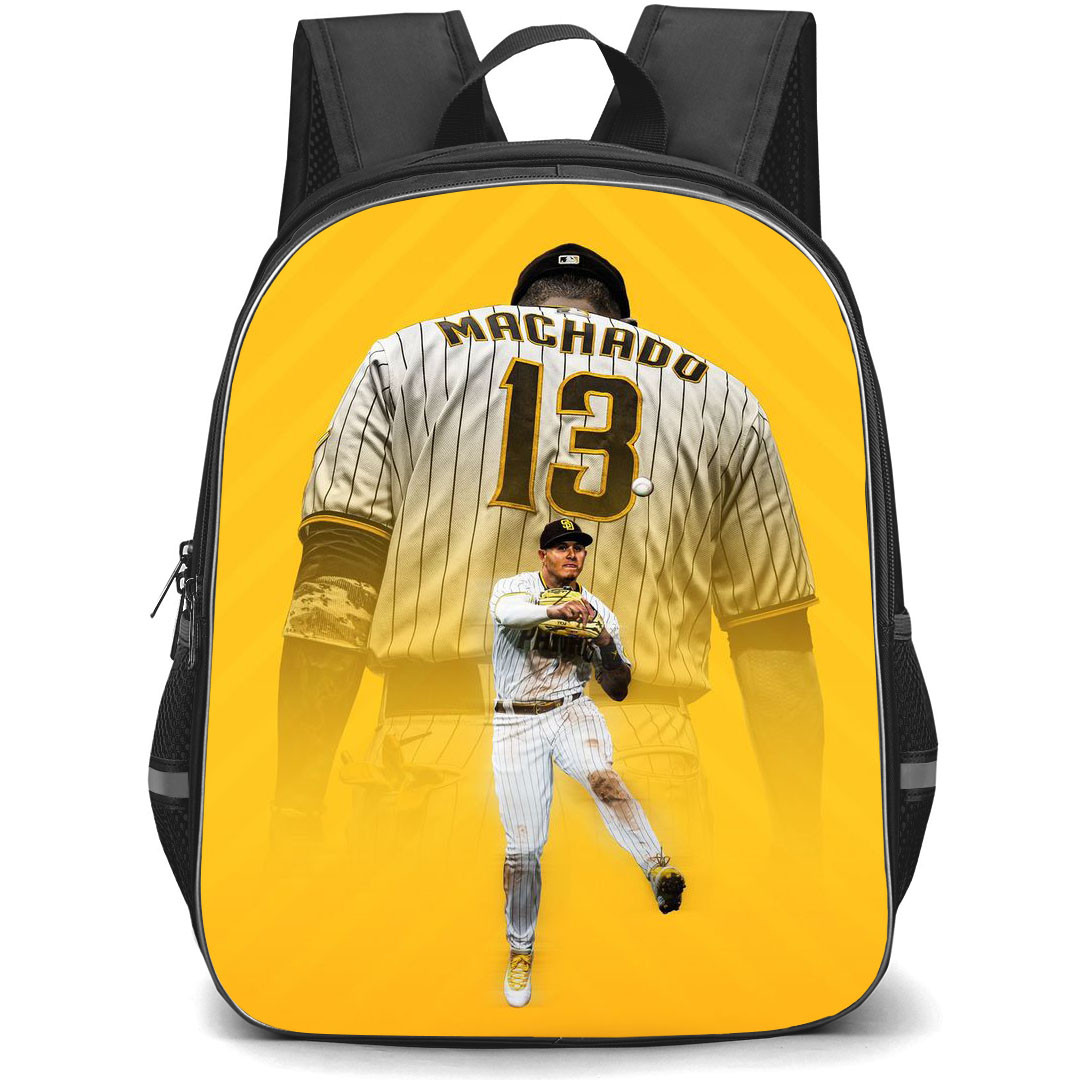 Shop the MLB Manny Machado Backpack StudentPack, showcasing an impactful Manny Machado 13 design on an eye-catching orange background, perfect for San Diego Padres fans. Carry your essentials with style and support your favorite team.Our StudentPack is ultra durable and trendy, designed especially for students both young and old. Featuring one main compartment, a front compartment, and all of the space you could ever imagine. Durable and lightweight, the StudentPack is the perfect throw-on-and-go backpack for students.Features:- Roomy main compartment- Front compartment- 2 mesh pockets on both sides- Built to last, high quality waterproof oxford cloth- Adjustable padded shoulder straps- Front pocket with built in organizer- Padding on the back panel for superior comfort- Padded grab handle on top- High quality metal zips- 100% recycled undyed linerSpecifications:Fabric: 100% Polyester Oxford ClothCapacity: 15L (Small size) / 27L (Large size)Weight: 17.63 oz / 500gDimensions: Large size: 16.5" x 13" x 6.3" / 42 x 33 x 16 cmSmall size: 13" x 11" x 6.3" / 32 x 28 x 16 cm