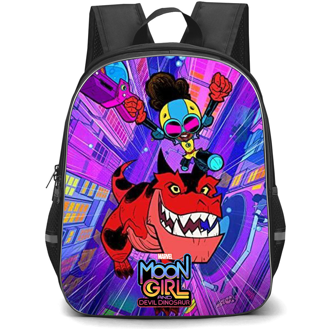 Shop the Moon Girl And Devil Dinosaur Backpack StudentPack - featuring a cool Moon Girl And Devil Dinosaur Falling design. Perfect for students on the go, this backpack is both practical and fun!Our StudentPack is ultra durable and trendy, designed especially for students both young and old. Featuring one main compartment, a front compartment, and all of the space you could ever imagine. Durable and lightweight, the StudentPack is the perfect throw-on-and-go backpack for students.Features:- Roomy main compartment- Front compartment- 2 mesh pockets on both sides- Built to last, high quality waterproof oxford cloth- Adjustable padded shoulder straps- Front pocket with built in organizer- Padding on the back panel for superior comfort- Padded grab handle on top- High quality metal zips- 100% recycled undyed linerSpecifications:Fabric: 100% Polyester Oxford ClothCapacity: 15L (Small size) / 27L (Large size)Weight: 17.63 oz / 500gDimensions: Large size: 16.5" x 13" x 6.3" / 42 x 33 x 16 cmSmall size: 13" x 11" x 6.3" / 32 x 28 x 16 cm