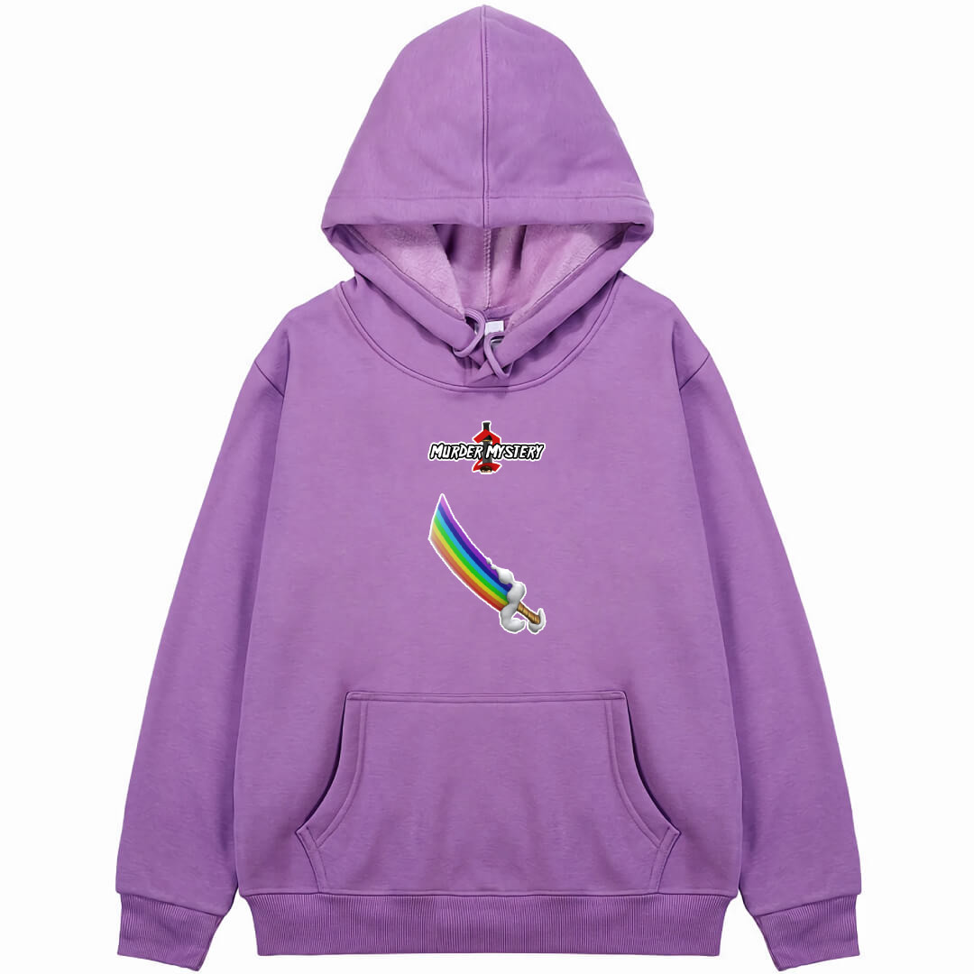 Shop the stylish Roblox Murder Mystery 2 Rainbow Knife Hoodie, featuring a hooded sweatshirt design that ensures optimum comfort and a trendy jacket appearance.This hoodie is made from a blend of cotton and polyester. Relaxed fit with a jersey-lined, drawstring hood, a kangaroo pocket, long sleeves and wide ribbing at the cuffs and hem. Soft brushed inside.Features:- Rib-knit cuffs and waistband for stretchability- Double-lined hood and color-matched drawcord- Side-seamed- Pouch pocket- Pullover type
