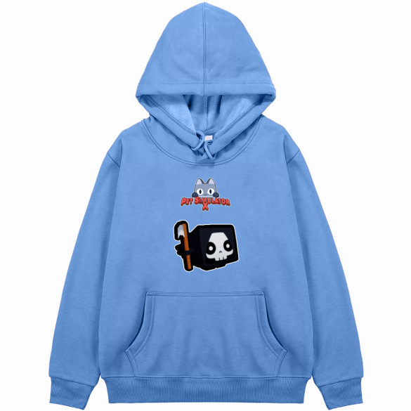 Upgrade your Roblox avatar with the stylish and edgy Reaper Hoodie. This comfortable hoodie features a Reaper Character sticker, perfect for fans of Roblox's Pet Simulator X.This hoodie is made from a blend of cotton and polyester. Relaxed fit with a jersey-lined, drawstring hood, a kangaroo pocket, long sleeves and wide ribbing at the cuffs and hem. Soft brushed inside.Features:- Rib-knit cuffs and waistband for stretchability- Double-lined hood and color-matched drawcord- Side-seamed- Pouch pocket- Pullover type