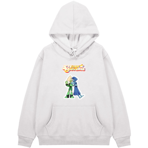 Get ready to show off your love for Steven Universe with this hoodie! Featuring a vibrant design showcasing Peridot and Lapis, this hooded sweatshirt is a must-have for any fan.This hoodie is made from a blend of cotton and polyester. Relaxed fit with a jersey-lined, drawstring hood, a kangaroo pocket, long sleeves and wide ribbing at the cuffs and hem. Soft brushed inside.Features:- Rib-knit cuffs and waistband for stretchability- Double-lined hood and color-matched drawcord- Side-seamed- Pouch pocket- Pullover type