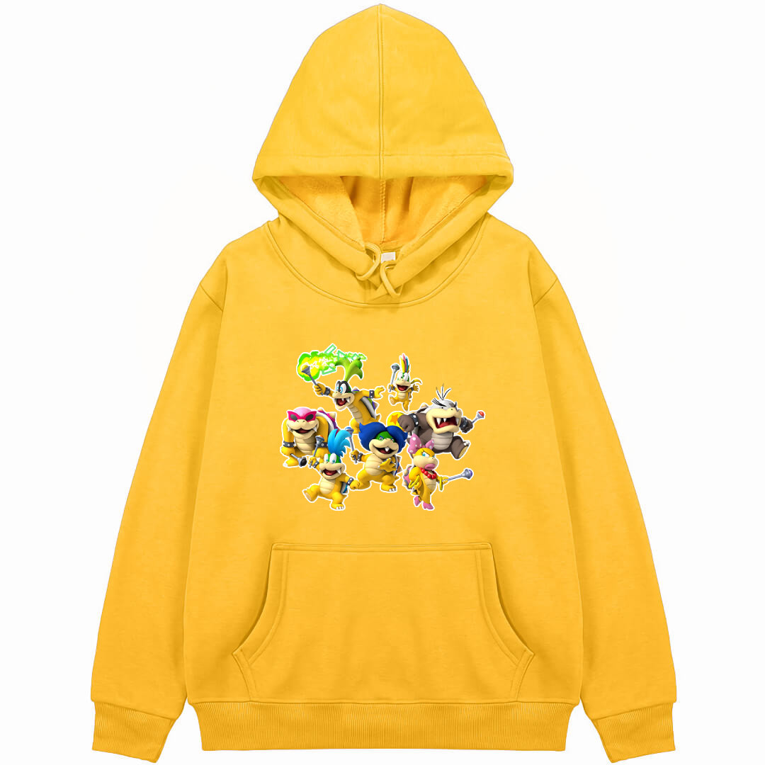 Get your hands on this stylish Super Mario Koopalings Hoodie featuring an eye-catching Koopalings Group Art design. Stay cozy and show off your love for the classic game with this comfortable and fashionable hooded sweatshirt.This hoodie is made from a blend of cotton and polyester. Relaxed fit with a jersey-lined, drawstring hood, a kangaroo pocket, long sleeves and wide ribbing at the cuffs and hem. Soft brushed inside.Features:- Rib-knit cuffs and waistband for stretchability- Double-lined hood and color-matched drawcord- Side-seamed- Pouch pocket- Pullover type