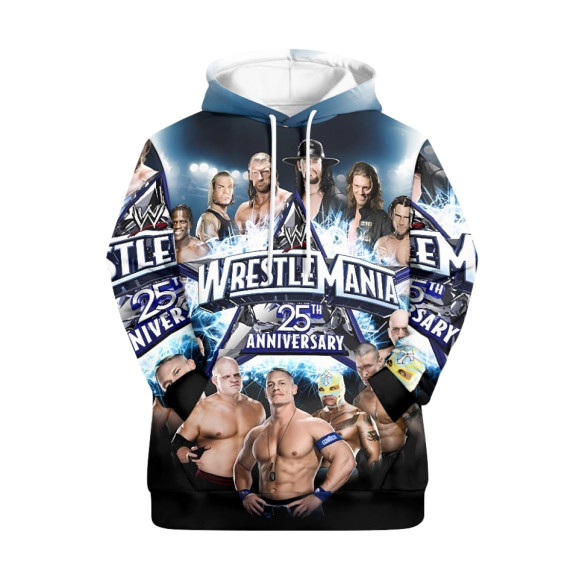 Stay warm and show off your love for WWE with this WrestleMania 25th Anniversary Official Poster hoodie pullover. Perfect for wrestling fans looking to stay cozy and stylish.This hoodie is made from a blend of cotton and polyester. Relaxed fit with a jersey-lined, drawstring hood, a kangaroo pocket, long sleeves and wide ribbing at the cuffs and hem. Soft brushed inside.Features:- Rib-knit cuffs and waistband for stretchability- Double-lined hood and color-matched drawcord- Side-seamed- Pouch pocket- Pullover type